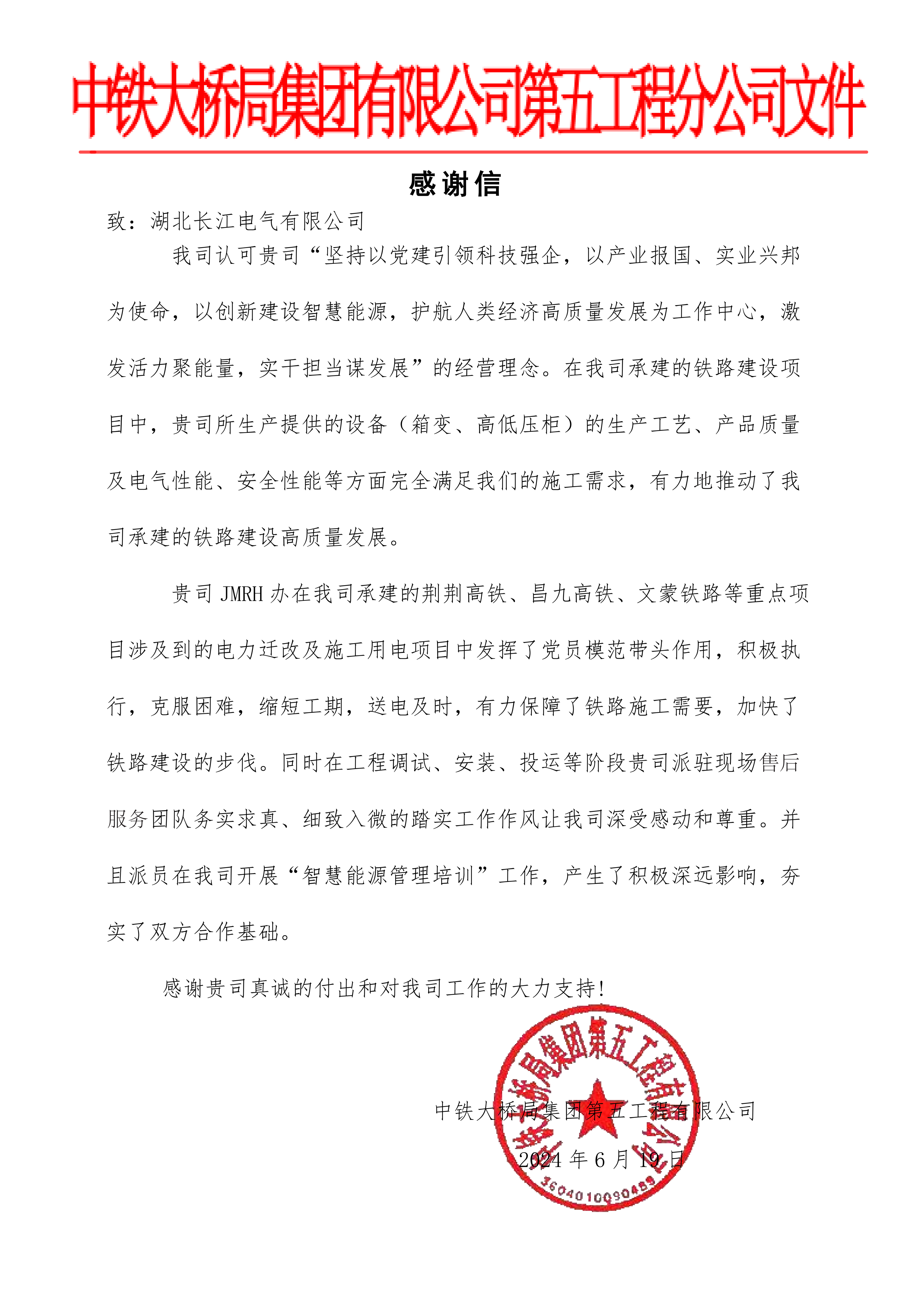 来自中铁大桥局五公司的感谢信