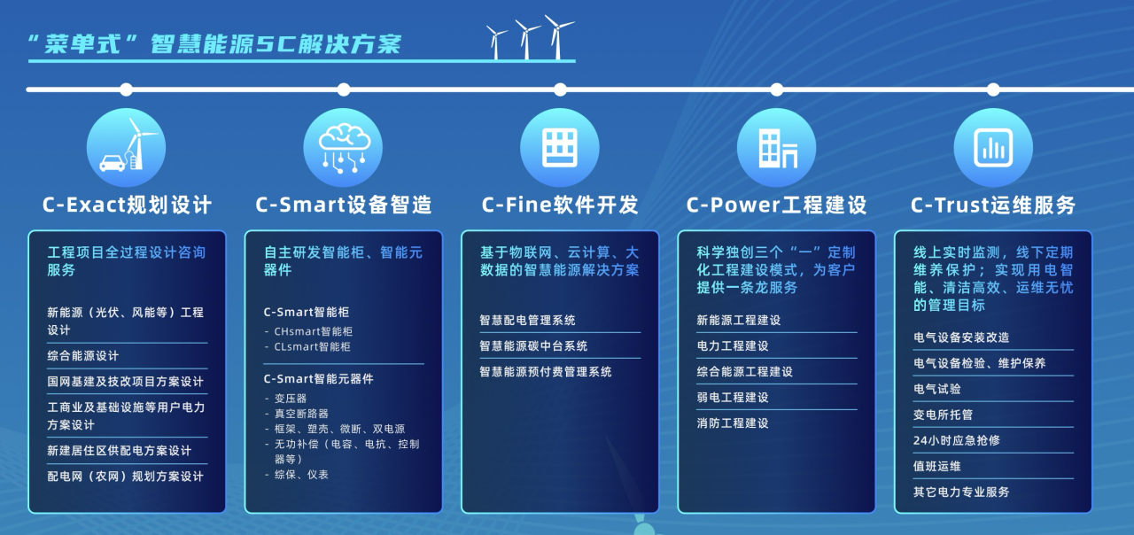 2020年,中国郑重向世界提出“双碳”目标。威廉希尔足球官网紧跟国家发展战略,根据客户对智慧能源应用的不同场景与不同需求,创新构建的“菜单式”智慧能源建设“5C”解决方案,规划设计、软件开发、设备智造、工程建设(含新能源工程、电力工程、综合能源工程、弱电工程、消防工程等)与运维服务,实现“源—网—荷—储—用”能源使用智能化。